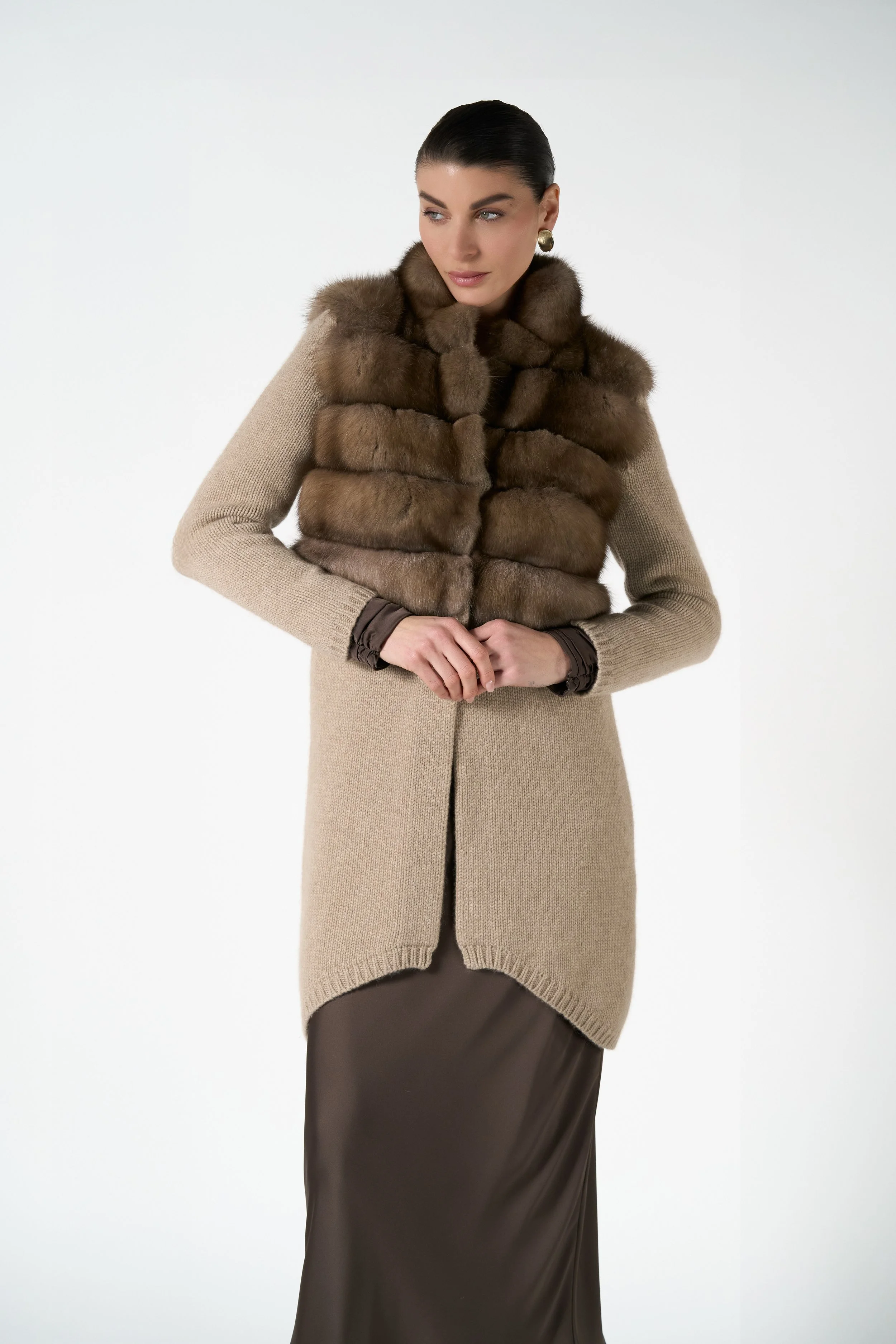 Introducing Isabel – a refined fusion of softness, structure, and luxurious texture. Crafted from plush sable and framed in buttery cashmere knit, this coat embodies understated elegance with a contemporary spirit. The silhouette is relaxed yet sophisticated, offering effortless drape and warmth without bulk. Thoughtful in every detail, Isabel balances comfort with couture – perfect for layering over everything from tailored looks to elevated loungewear. Timeless and tactile, it’s a piece that speaks to quiet confidence and enduring style.